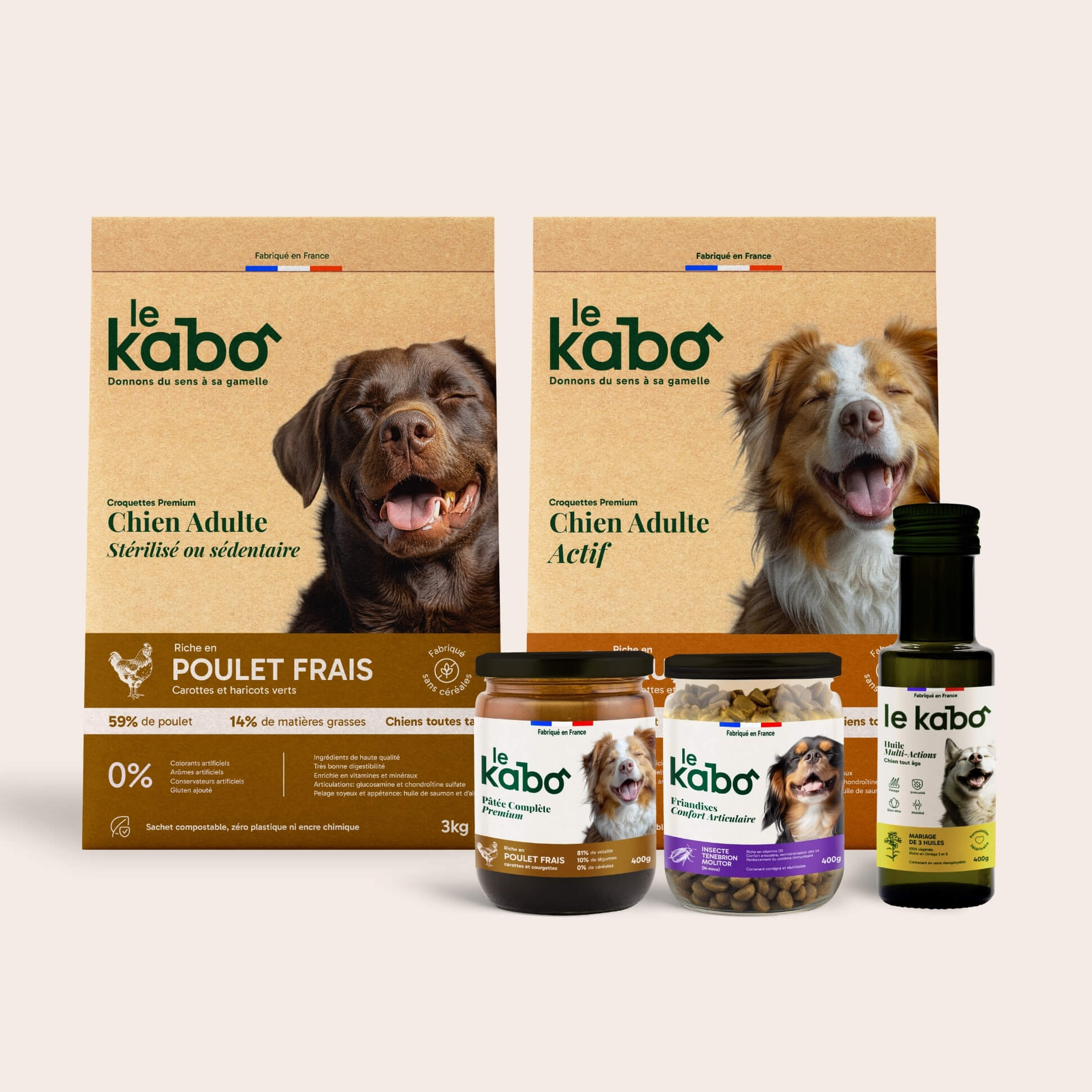 Nos emballages sont éco-conçus. Nos sachets de croquettes sont zéro plastique, avec du papier non blanchi, une encre sans solvant chimique et doublés d’un film étanche en amidon de maïs. Nos flacons sont en verre. Matériau sûr, écologique, réutilisable et recyclable à l’infini.