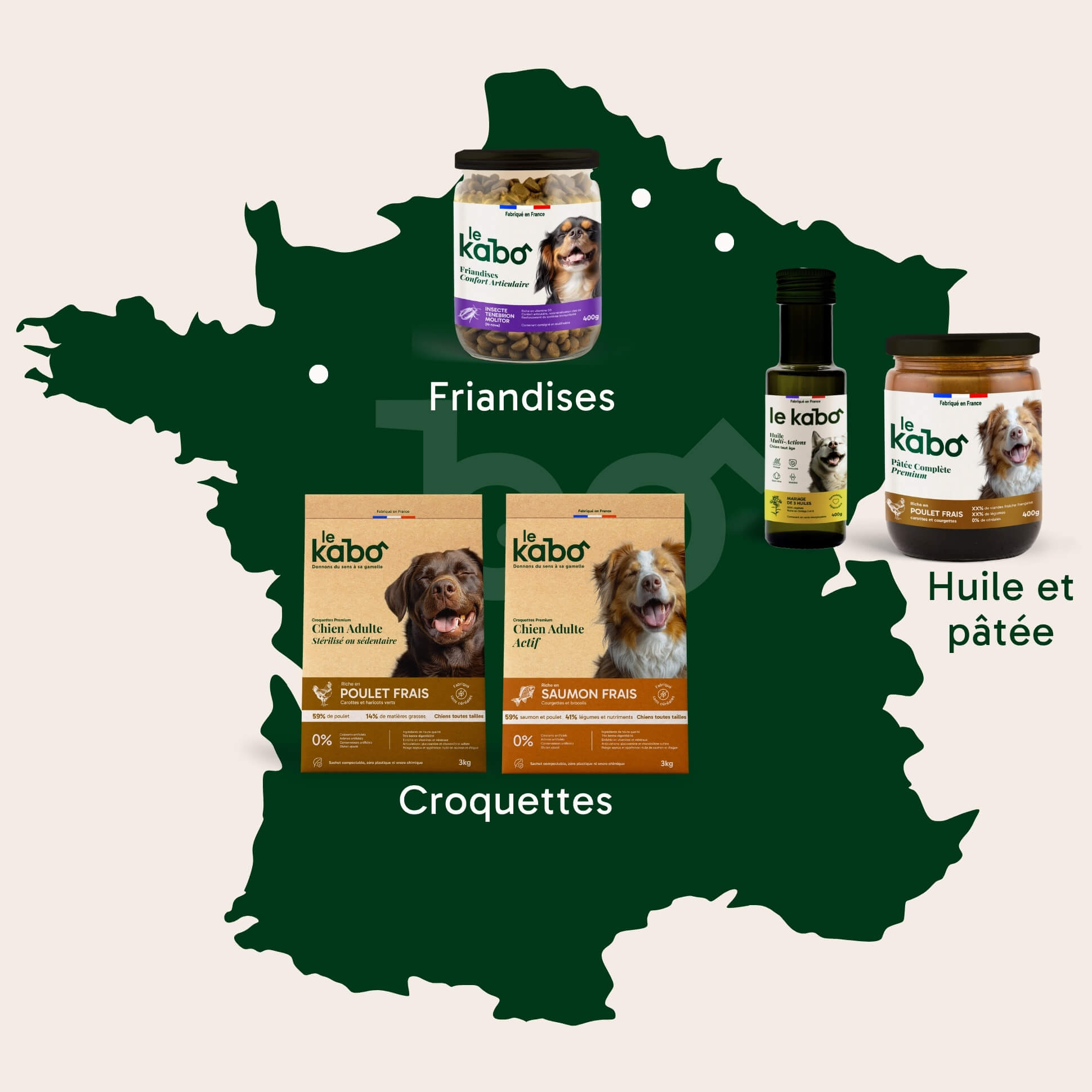 Chez Le Kabo, nous concevons, fabriquons et commercialisons des produits d'alimentation premium spécialement conçus pour nos chiens.