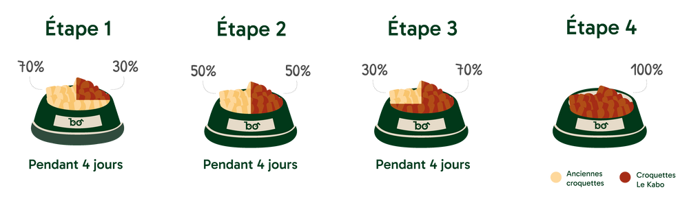 - Les 4 premiers jours : remplacez 1/4 des anciennes croquettes par des nouvelles.