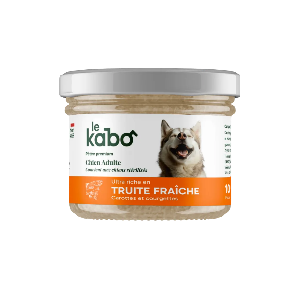 La délicieuse pâtée Le Kabo à la truite est un aliment complémentaire de qualité pour chien, à proposer en complément d’une alimentation complète et équilibrée, comme des croquettes ou une ration ménagère. Riche en protéines de qualité et pauvre en matières grasses, elle convient particulièrement aux chiens stérilisés, âgés ou peu actifs.