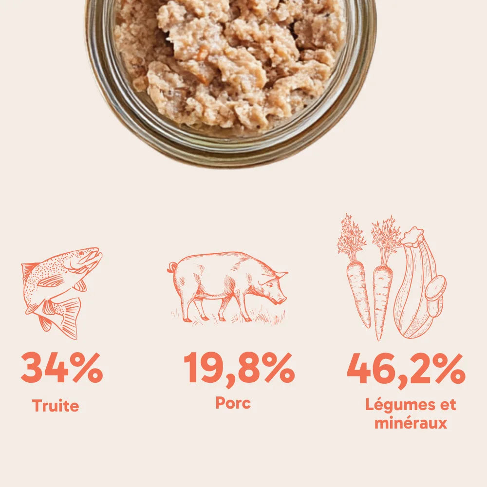 Une recette savoureuse et originale, spécialement pensée pour nos compagnons canins. Ultra riche en protéines, avec une composition simple et transparente : 53,8% de protéines (truite et porc) et 46,2% de légumes et nutriments essentiels.